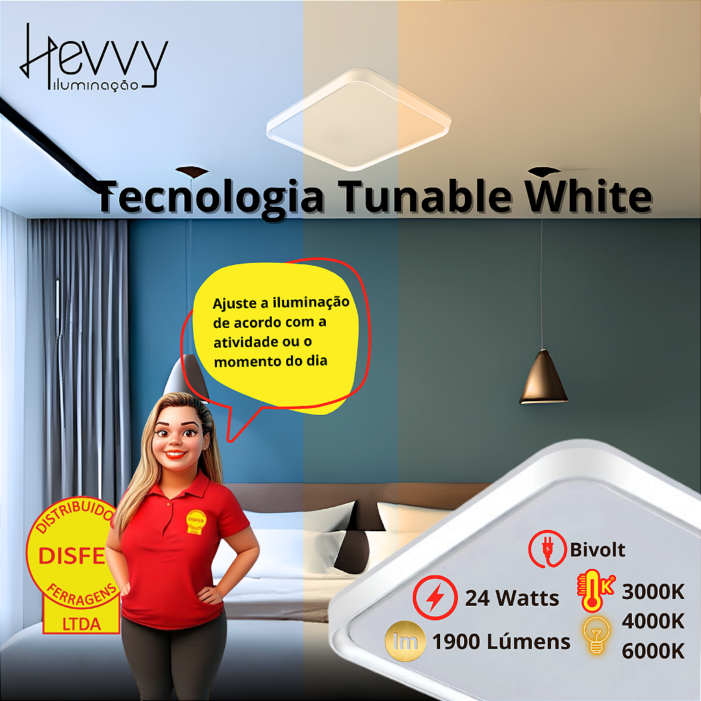 Com a tecnologia Tunable White, você escolhe a temperatura de cor direto no interruptor. Quer um clima aconchegante? Vai de 3000K. Mais neutro? 4000K. Precisa de foco e luz branca? 6000K. Mudou de ideia? Muda a cor. Simples assim.