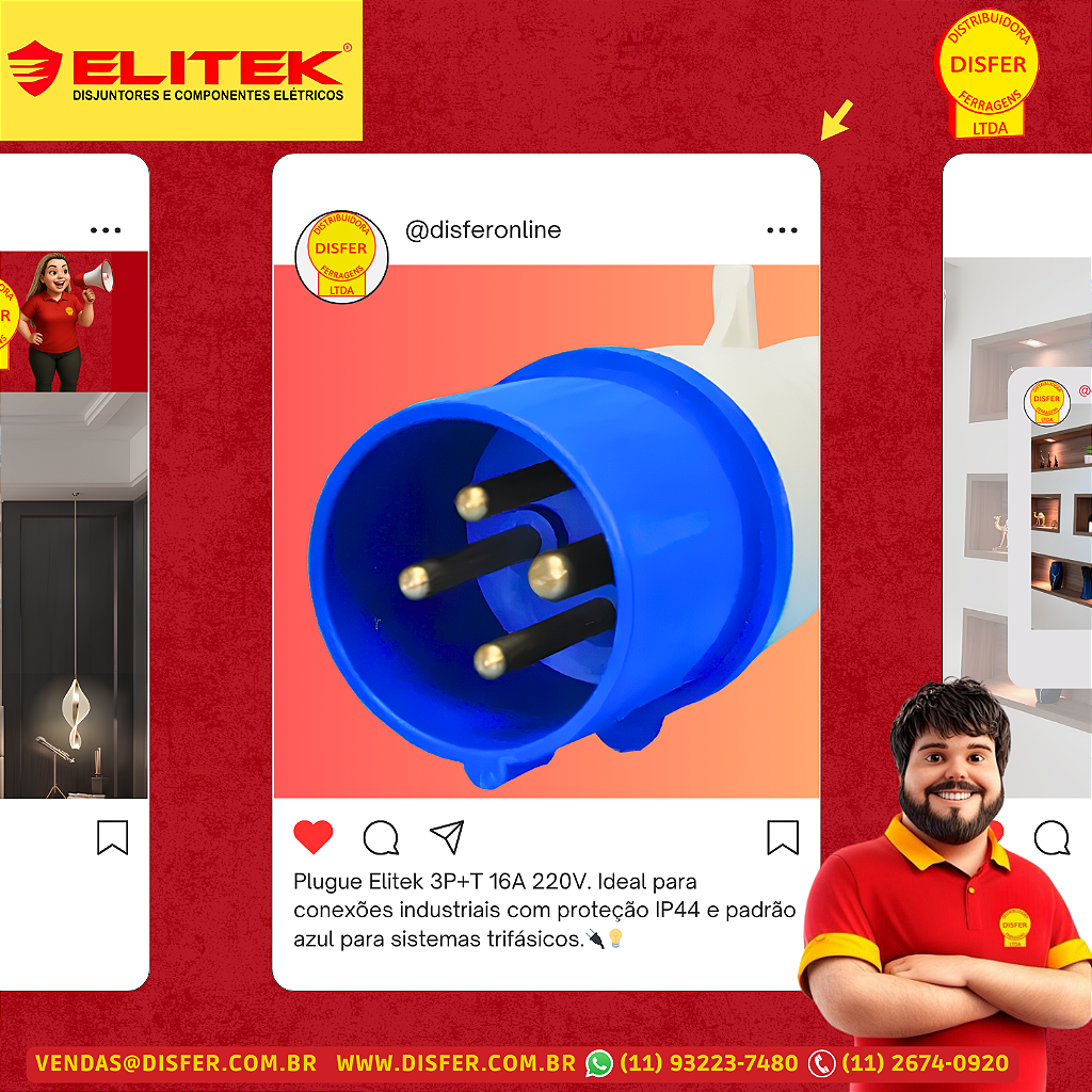 O plugue industrial Elitek E40B79 oferece performance confiável em ambientes que exigem energia constante e segura. Com 3P+T, suporta 16A em 220V, ideal para sistemas trifásicos com aterramento. Com grau de proteção IP44, é resistente a poeira e respingos d’água, garantindo durabilidade e segurança.