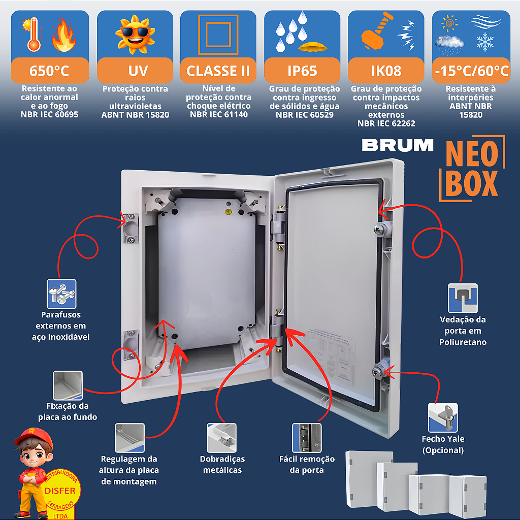 Se você precisa de um quadro de comando resistente, seguro e pronto para qualquer desafio, o NEOBOX 500x400x200mm da Brum é a escolha ideal! Projetado para ambientes exigentes, ele oferece proteção reforçada contra poeira, jatos d’água, impactos e raios UV, garantindo máxima durabilidade e segurança para instalações elétricas e automação.