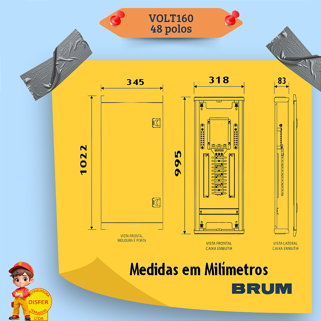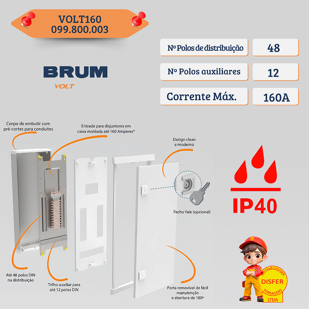 Se você precisa de um quadro de distribuição robusto, seguro e funcional, o VOLT160 da Brum é a escolha perfeita! Com 48 polos de distribuição e 12 polos auxiliares, ele suporta até 160A, garantindo eficiência e organização para sua instalação elétrica.
