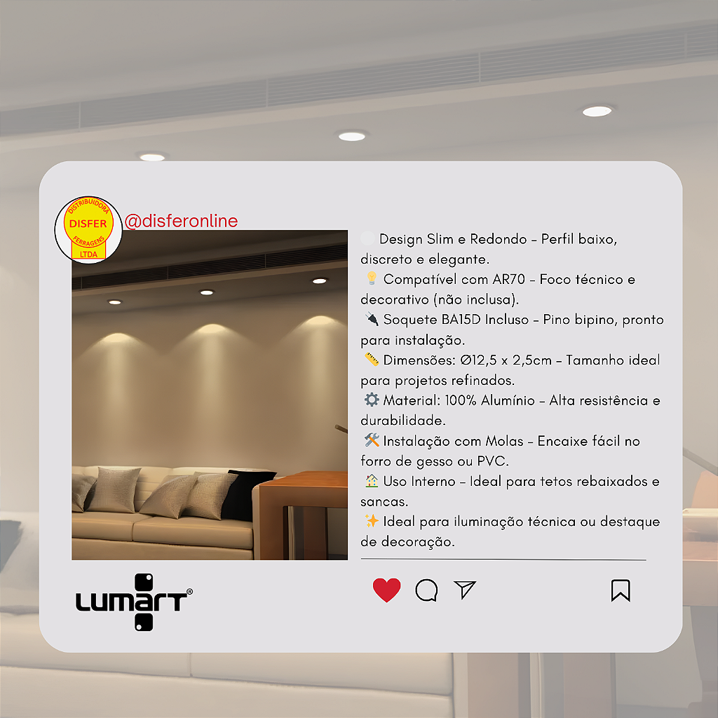 “Por ser compatível com AR70 e soquete BA15D, é importante verificar o espaço interno do forro, pois a lâmpada costuma ter corpo profundo. O recorte ideal é de aproximadamente 10 cm, garantindo que o encaixe das molas fique firme e que a borda do spot fique rente ao teto.”
