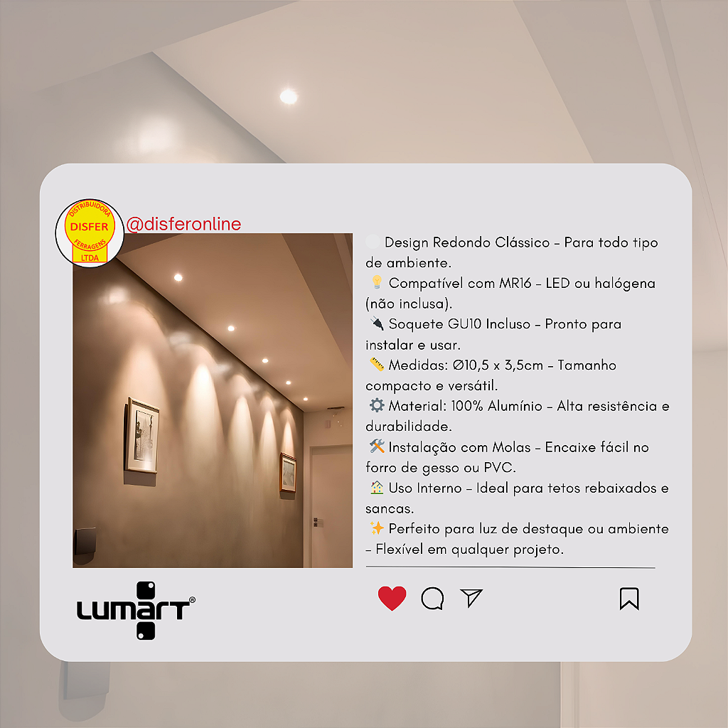 Com diâmetro de 10,5 cm e altura de 3,5 cm, é um modelo versátil e fácil de instalar, ideal para forros de gesso, PVC ou modulado, tanto em ambientes residenciais quanto comerciais. Acompanha soquete GU10 incluso, pronto para receber lâmpadas MR16 (não inclusas).