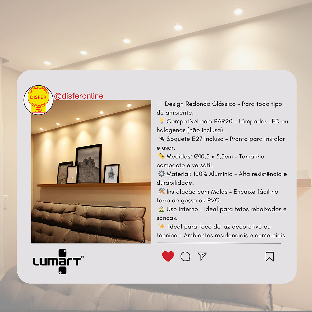 Com diâmetro de 10,5 cm e altura de 3,5 cm, esse spot é indicado para lâmpadas PAR20 com soquete E27 (incluso) e se adapta facilmente a forros de gesso, PVC ou modulado, tanto em ambientes residenciais quanto comerciais.