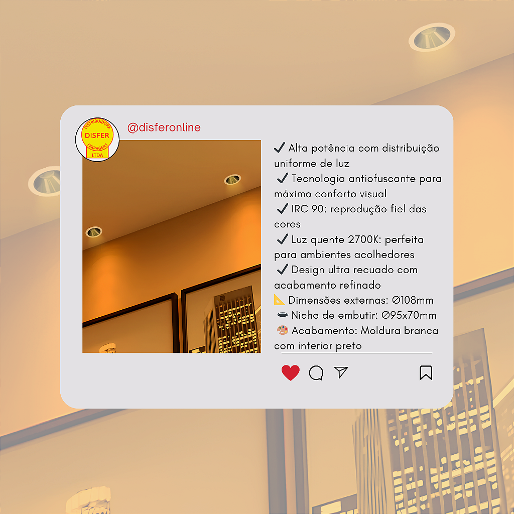Com 1800 lúmens, IRC 90 e luz quente em 2700K, o Spot Mira de 18W proporciona iluminação intensa e aconchegante, com foco preciso e sem ofuscamento, graças ao seu design ultra recuado.