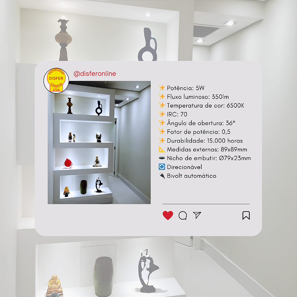 Ele entrega 350lm de brilho bem focado, com feixe de 36°, perfeito pra valorizar detalhes e dar aquela sensação de amplitude nos ambientes.
