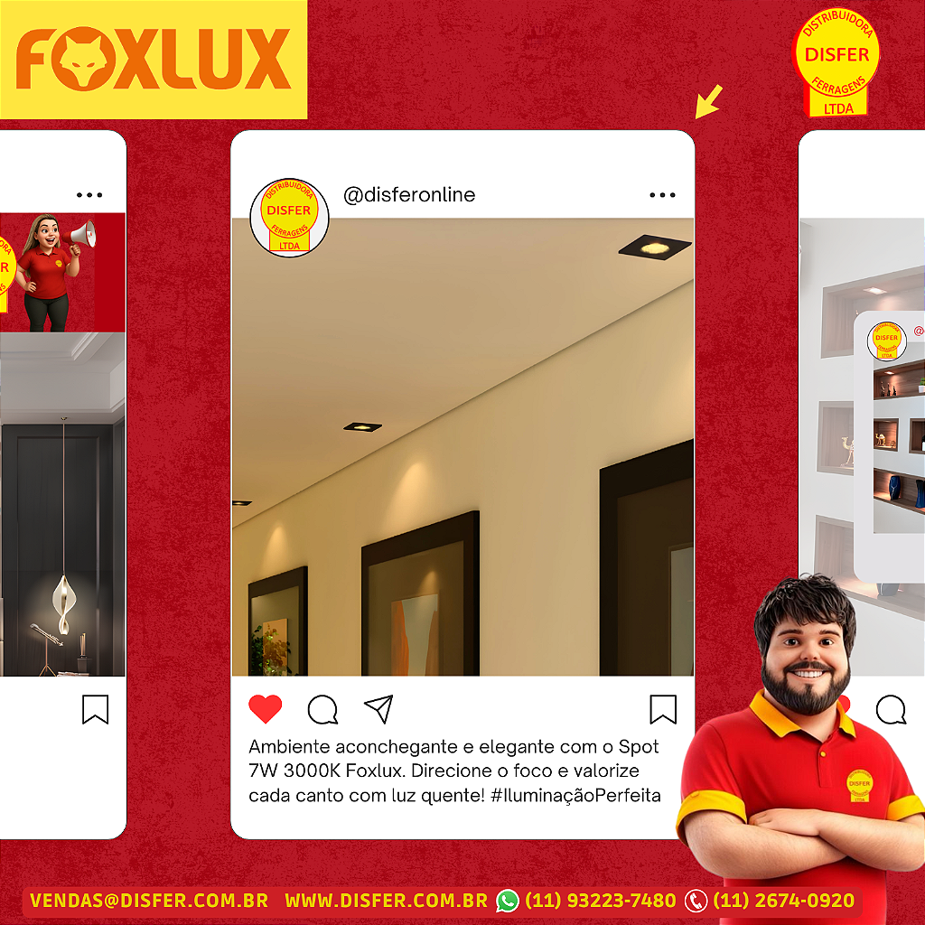 A Disfer recomenda que a infraestrutura para instalação seja organizada com o produto em mãos, evitando complicações como furos e recortes desnecessários. O modelo LED90.708 oferece 6 meses de garantia da loja e 12 meses diretamente com o fabricante.