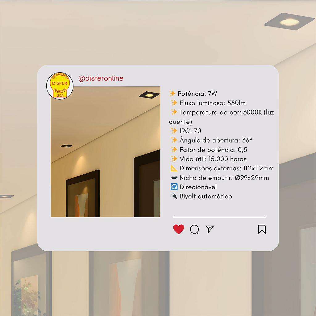 Com 7W de potência e 550 lúmens, esse spot entrega iluminação quente (3000K), ideal para criar ambientes confortáveis, sofisticados e com aquele toque de elegância.
