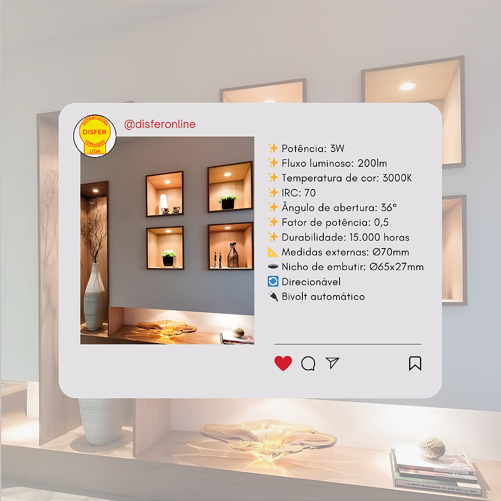 Com luz quente de 3000K, 200lm de brilho e um feixe direcionável de 36°, ele dá o toque certo de aconchego e destaque — perfeito pra nichos, corredores, painéis ou qualquer projeto compacto.