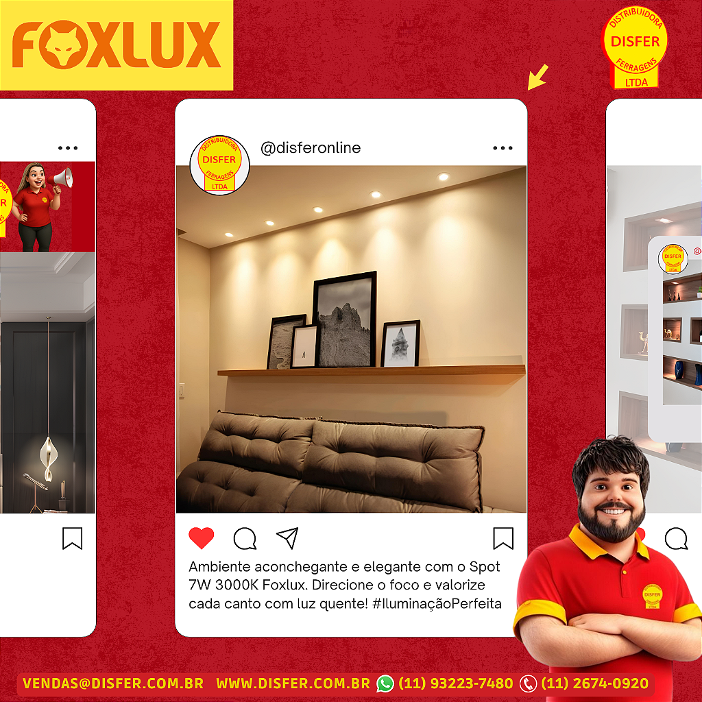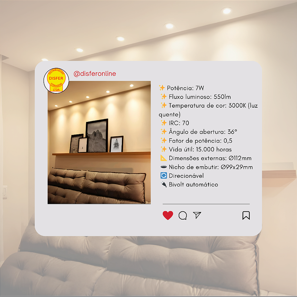Com 7W de potência e 550 lúmens, esse spot entrega iluminação quente (3000K), ideal para criar ambientes confortáveis, sofisticados e com aquele toque de elegância.