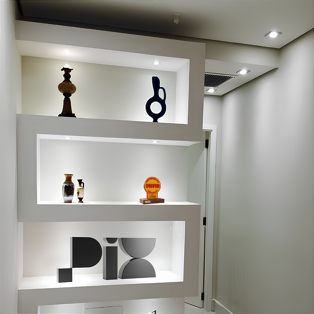 Iluminação moderna e precisa para valorizar detalhes dentro do mobiliário.