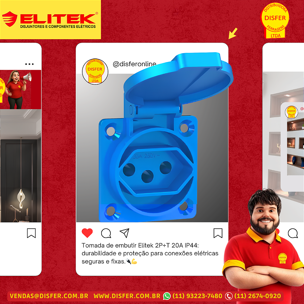 A Tomada de Embutir Elitek é ideal para ambientes que exigem conexões elétricas duráveis e seguras. Com capacidade para 20A e compatível com tensões de 127 a 250V, ela possui padrão 2P+T e corpo em termoplástico de alta resistência, sendo indicada para uso industrial, técnico e comercial.