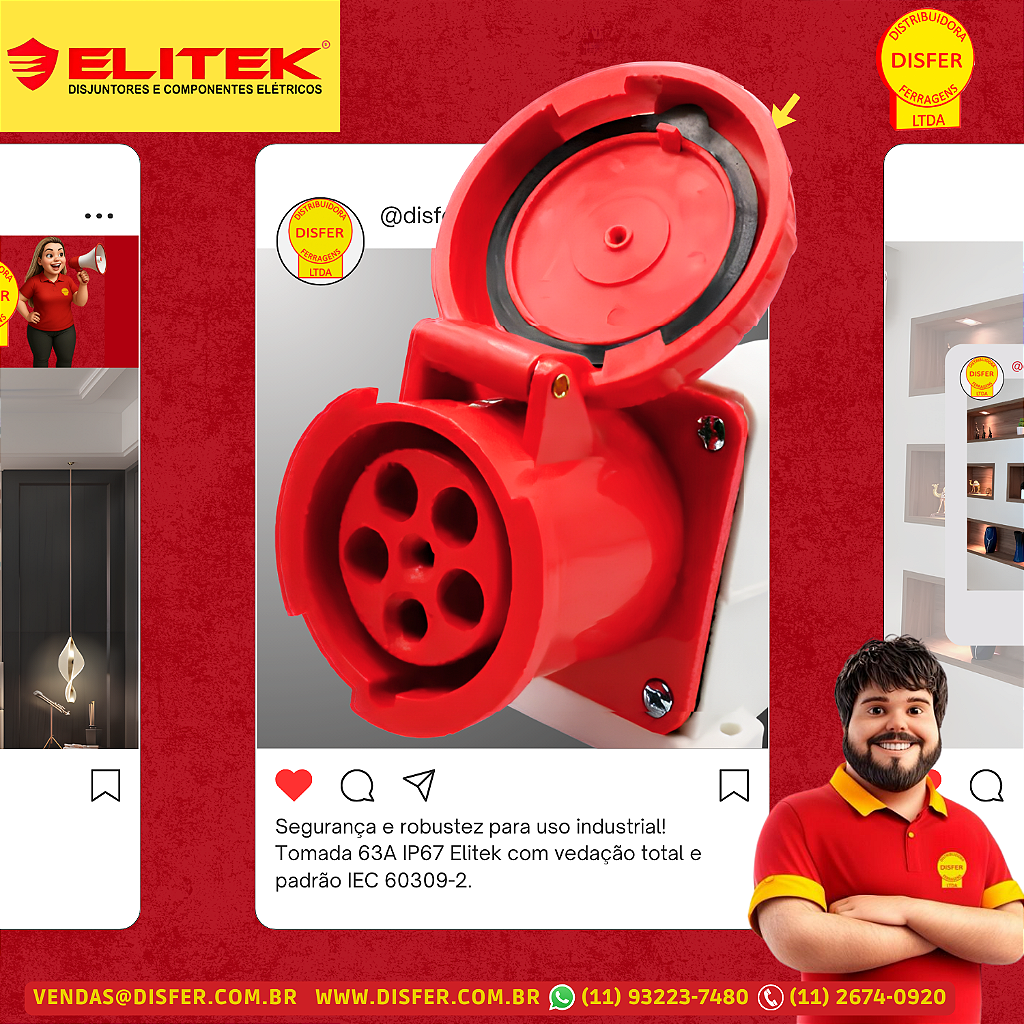 Alta performance para instalações industriais exigentes. A Tomada de Sobrepor Elitek 63A com grau de proteção IP67 garante conexão segura, mesmo em ambientes com umidade e poeira. Ideal para aplicações trifásicas pesadas em 380/440V, conta com corpo robusto, design normatizado e encaixe perfeito com plugues industriais do mesmo padrão (6H).