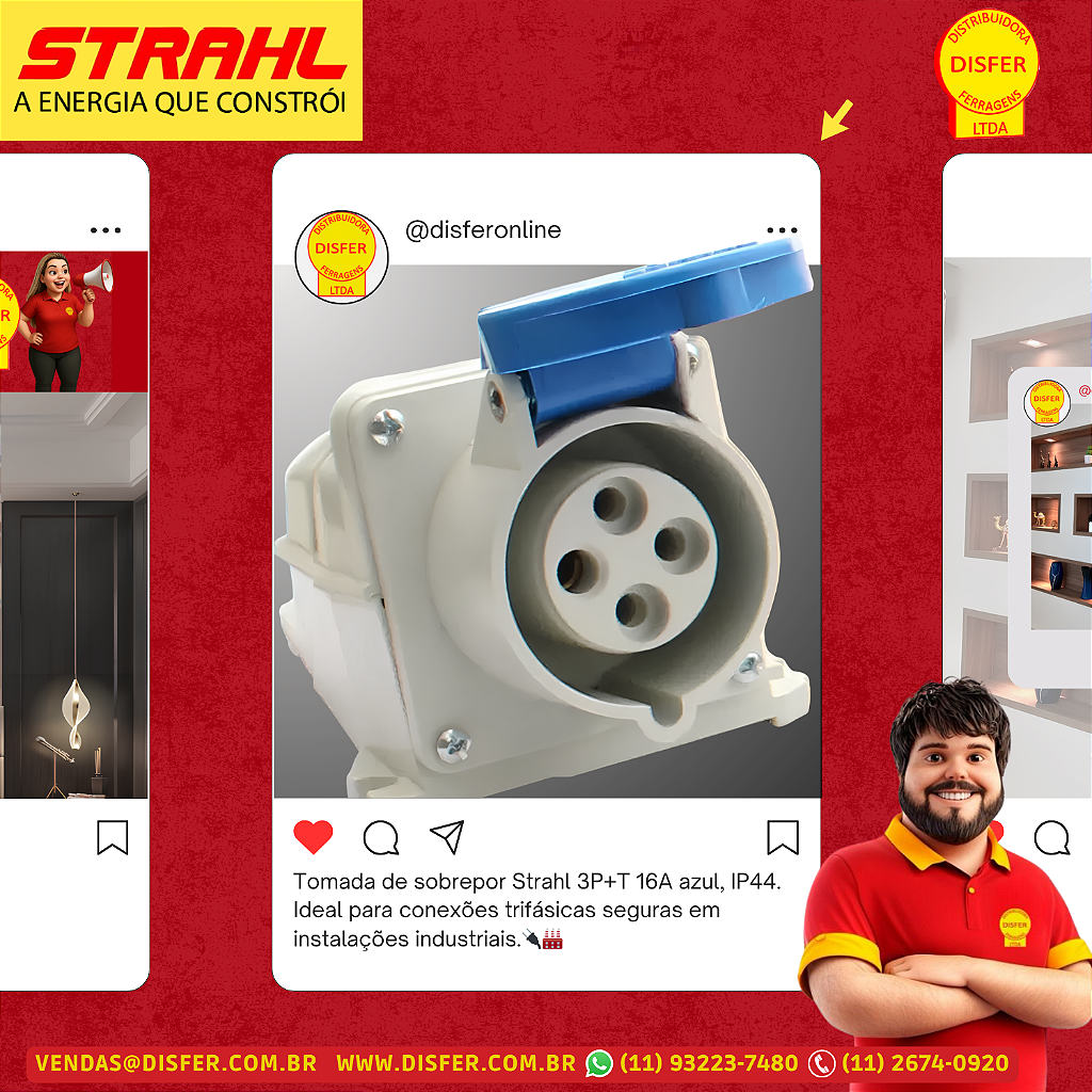 A Tomada de Sobrepor Strahl 3P+T 16A oferece uma solução segura e confiável para conexões elétricas em ambientes industriais e comerciais. Projetada conforme a norma IEC 60309, é ideal para aplicações com tensão de 220/240V em sistemas trifásicos com terra.