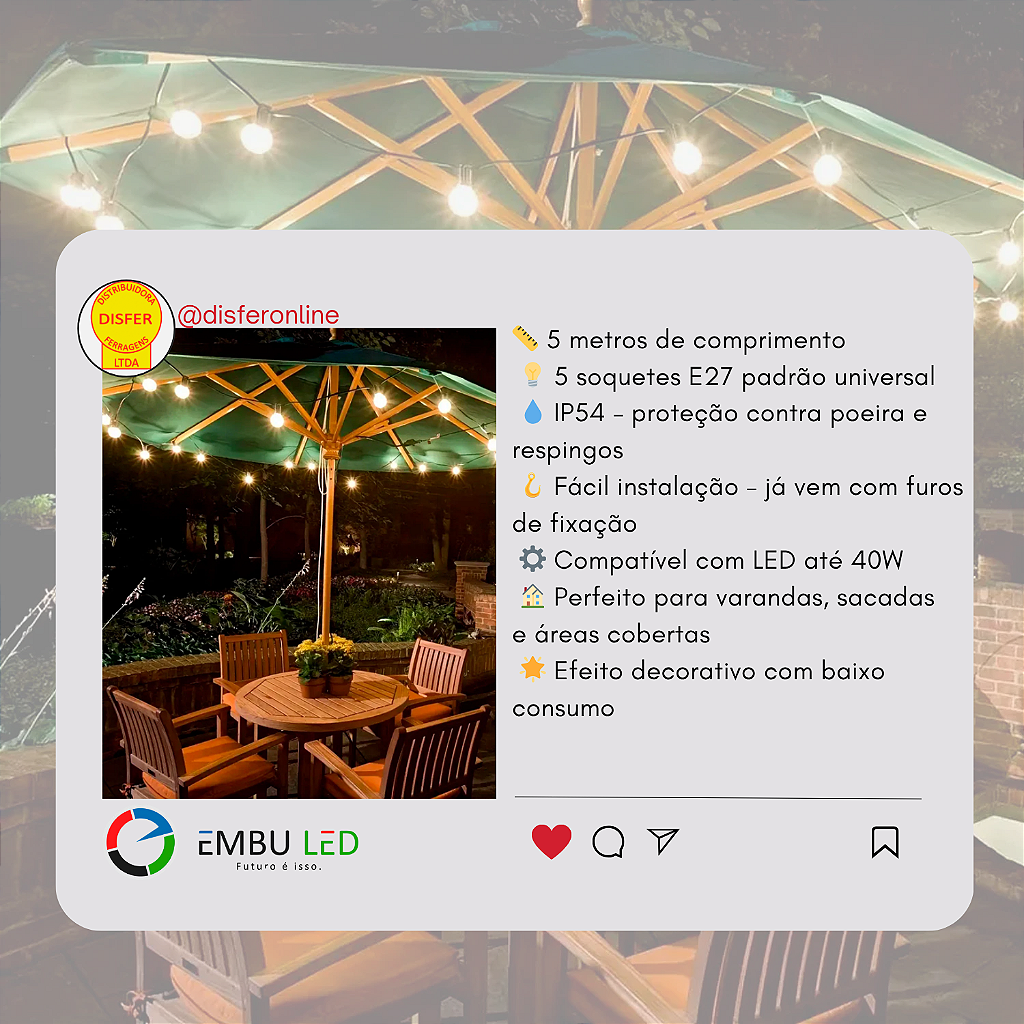 💡 Varal de Luzes ECO 5 metros com 5 Soquetes E27 | IP54 | Embuled